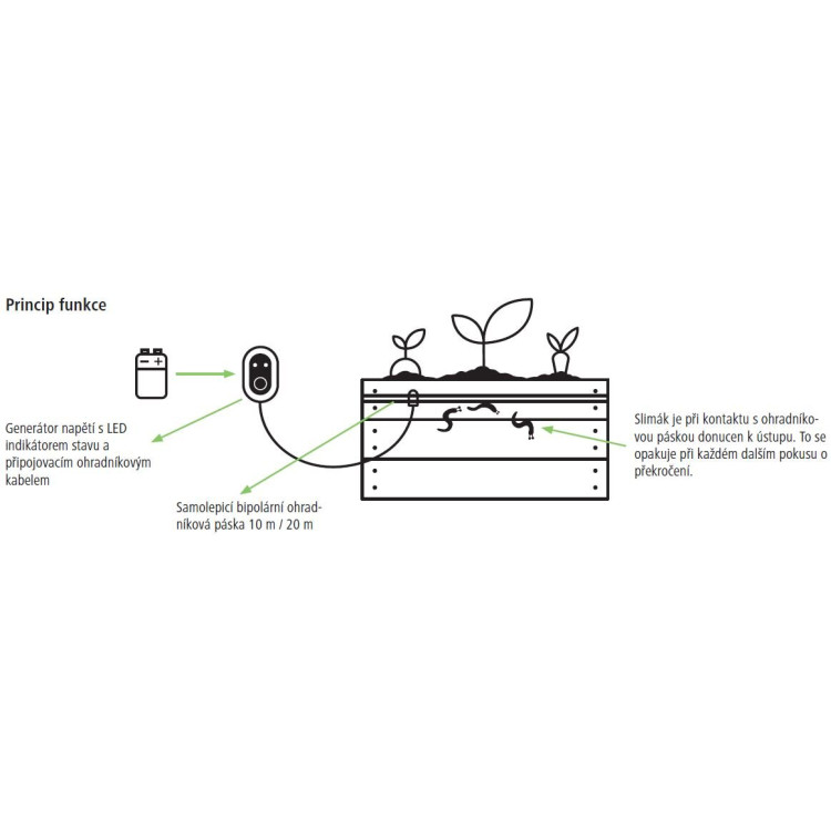 Grede zaščitite pred polži brez uporabe strupov in kemičnih sredstev. Polž s svojim vlažnim telesom poveže dve prevodni letvici na traku in s tem sklene tokokrog. Nastane kratek električni impulz, ki polžu povzroči neprijeten občutek, zato se obrne nazaj. Sistem polžev ne ubija – samo odvrača od prečkanja pregrade.