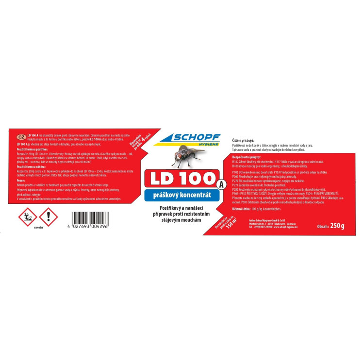 SCHOPF LD 100 A praškasti koncentrat je učinkovito sredstvo za zatiranje hlevskih muh v hlevih, perutninskih hišah in kmetijskih poslopjih. Ponuja skoraj takojšen učinek in dolgotrajno zaščito do nekaj tednov.