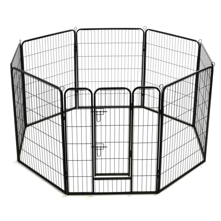 Visokokakovostna kovinska ograda za pse in druge živali . Ima široko paleto uporabe tako v zaprtih prostorih kot na prostem. Oblikovanje je mogoče poljubno. Če paket kupite večkrat, lahko ustvarite res veliko ogrado. Elementi so preprosto med seboj povezani s palico od zgoraj skozi spoje. Na prostem lahko te palice zapičite tudi v tla, ogrado pa zasidrate in pritrdite v tla.