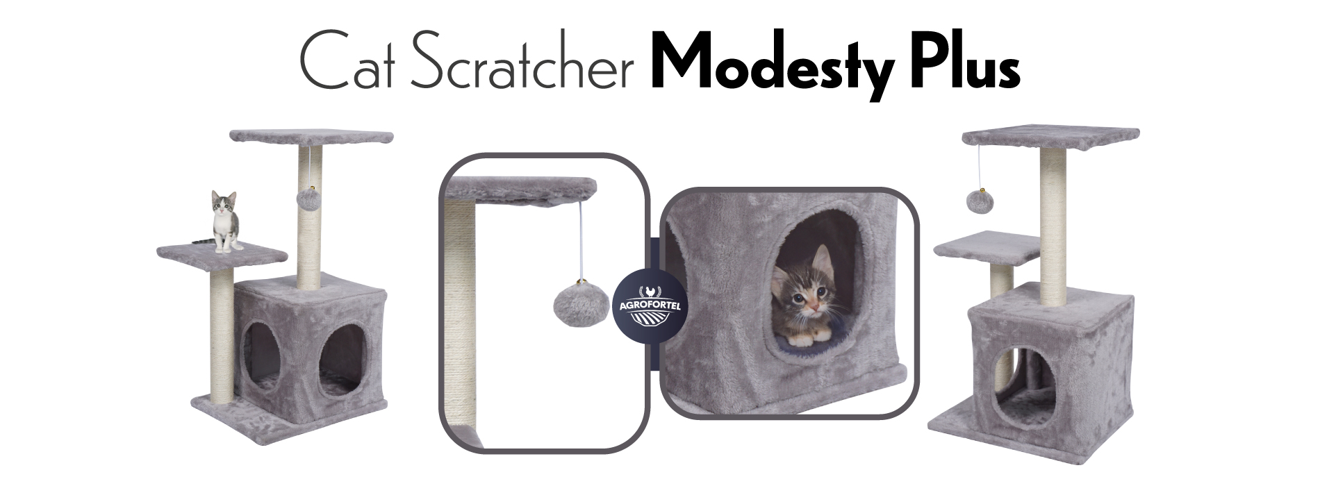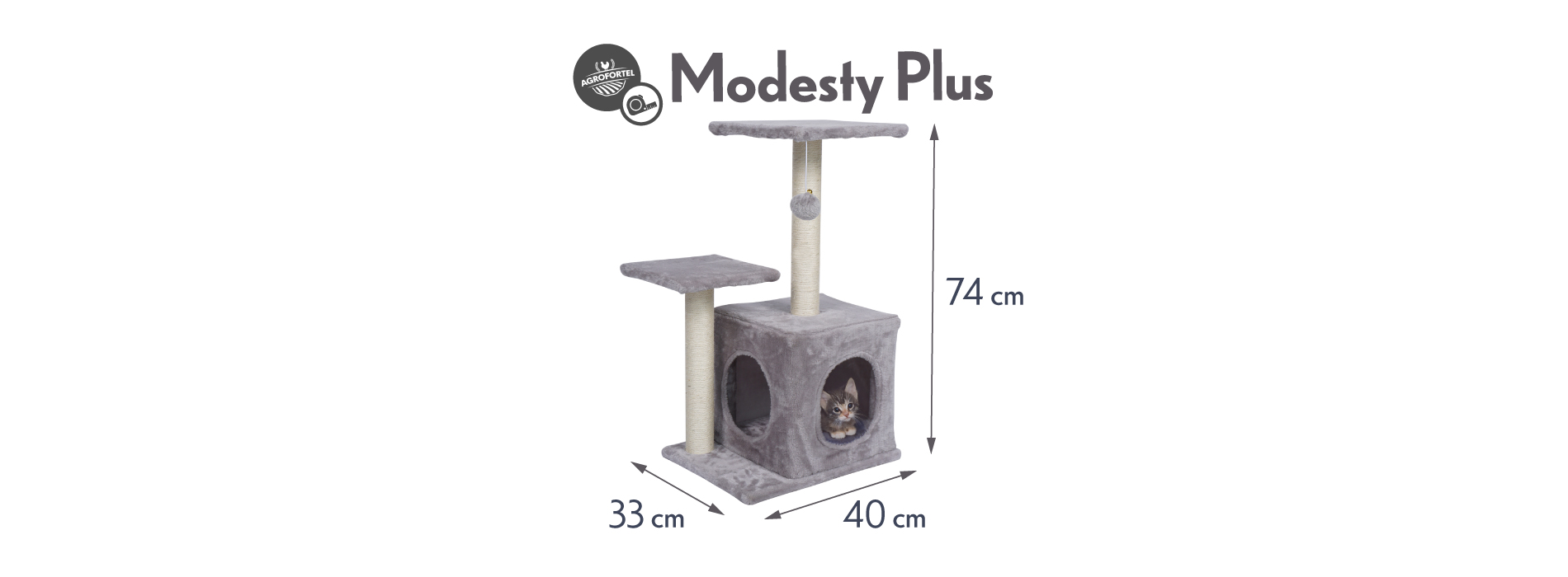 Vam vaš kosmati ljubljenček praska po kavču in pleza po zavesah? Nič več z našim razvajenim praskalnikom! Poskrbite za svojo muco, da bo lahko nekaznovano skrbela za svoje kremplje . Modesty Plus je izboljšan model Modestyja - plišasti hišici in sisalovemu praskalniku s platformo doda še en sisalov steber in plišasto platformo. Ima tudi viseči cof za igro.