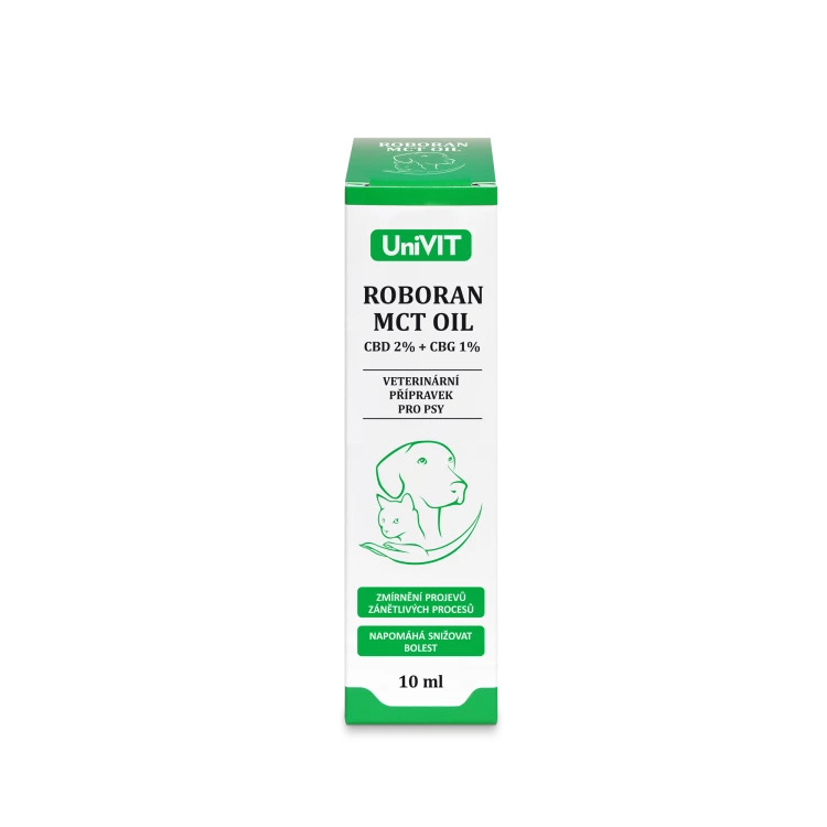 Roboran MCT OIL CBD2%+CBG1% je tekoči veterinarski izdelek, ki uporablja širok spekter učinkov naravnega kanabidiola (CBD) in kanabigerola (CBG). Ti kanabinoidni komponenti sta raztopljeni v MCT olju, ki je nežno pridobljeno iz kokosovega olja. Naravni snovi CBD in CBG sta nestrupena, nehalucinogena kanabinoida, ki prispevata k celotnemu energijskemu ravnovesju telesa. MCT olje izboljšuje spomin, stanje črevesja in pomaga zniževati raven sladkorja v krvi.