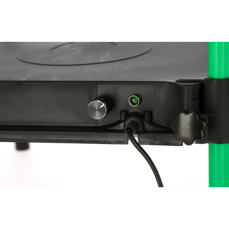 Vrtljiv gumb za hitro fino nastavitev temperature, noge z možnostjo nastavitve višine za prilagoditev razdalje do piščancev in enakomernejšo porazdelitev toplote.